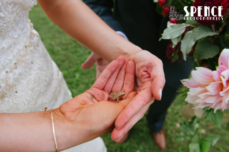 This tiny frog hopped a ride on Megan’s wedding dress!